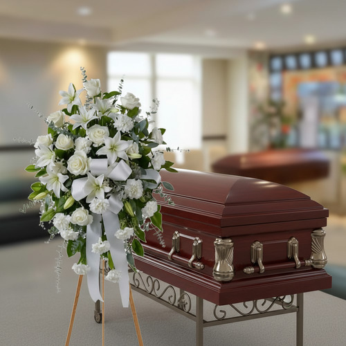 The Until Soon Funeral Pedestal See You Soon is a beautiful and delicate pedestal that allows you to express your condolences to the relatives of that being who has departed, it is made up of white Lilies, white Roses and green Foliage.