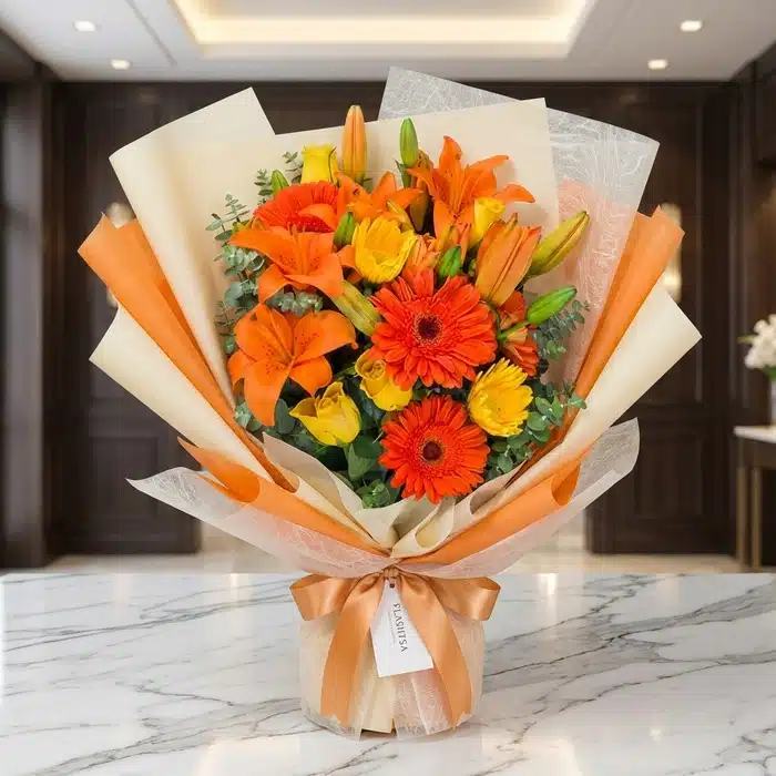 💐 Imagina la alegría de recibir un rayo de sol en forma de flores. ☀️ Este bouquet de flores deslumbra con sus colores vibrantes, combinando la energía de las gerberas y lirios naranja con la calidez de las rosas amarillas. Su aroma fresco y la delicada textura de sus pétalos lo convierten en el regalo perfecto para iluminar el día de alguien especial y expresar tus mejores sentimientos.