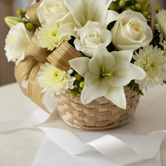 Nuestro cubre cofre es una ofrenda solemne y serena, cuidadosamente elaborada en cesta con la pureza de las rosas y lirios blancos, símbolos de paz y luz. Cada flor es seleccionada para honrar la memoria de quien ha partido y brindar consuelo a sus seres queridos.